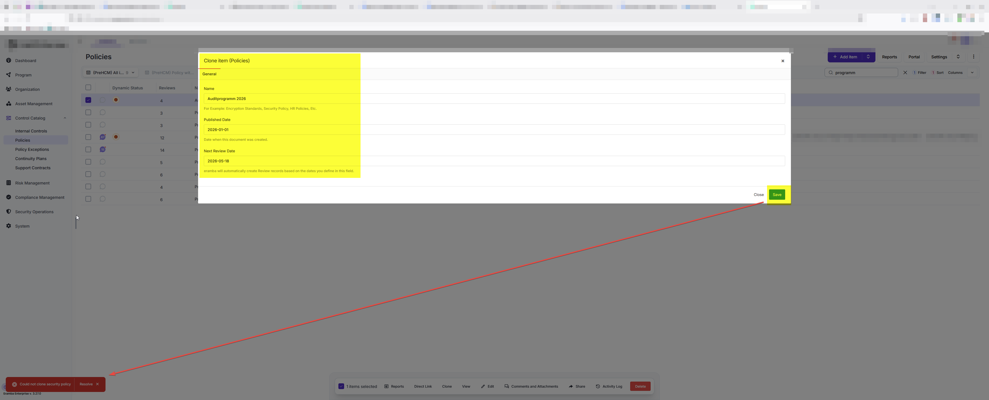 I go to security policies, select one, click clone, change the name, add the published date, add the next review date, click save and get error: Could not clone security policy.