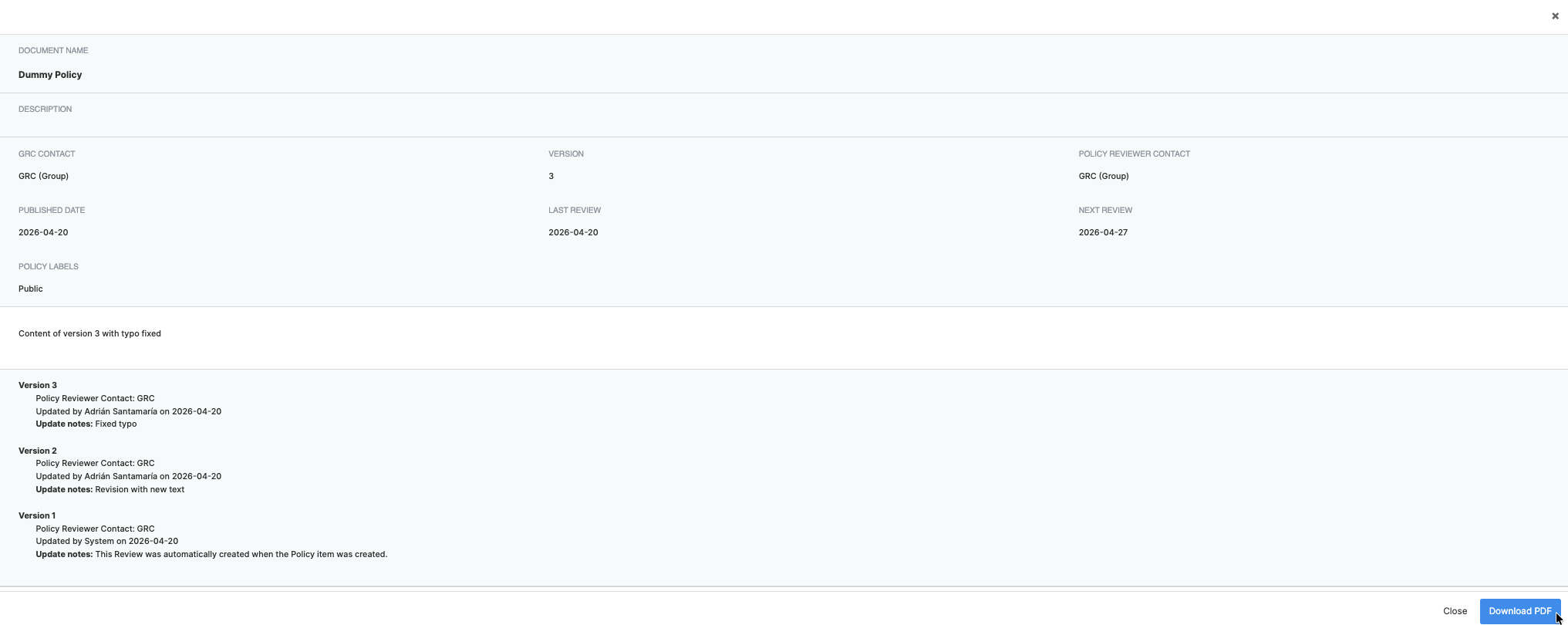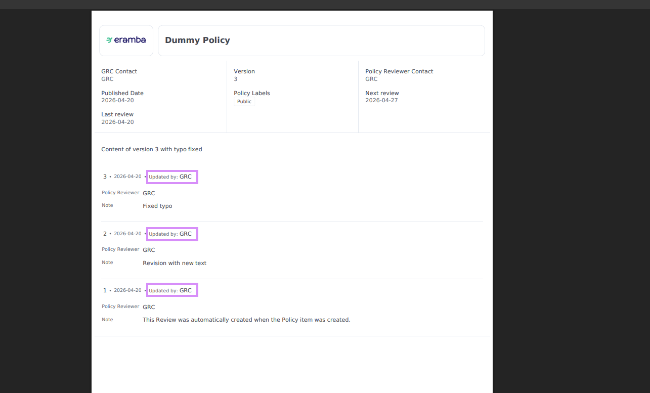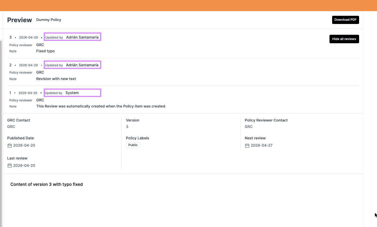 After updating to version 3.29.0, policy document reviews are displayed inconsistently across the Document View, Policy Portal, and downloaded PDFs. In several cases, the review order is incorrect and the “Updated by” field is missing.