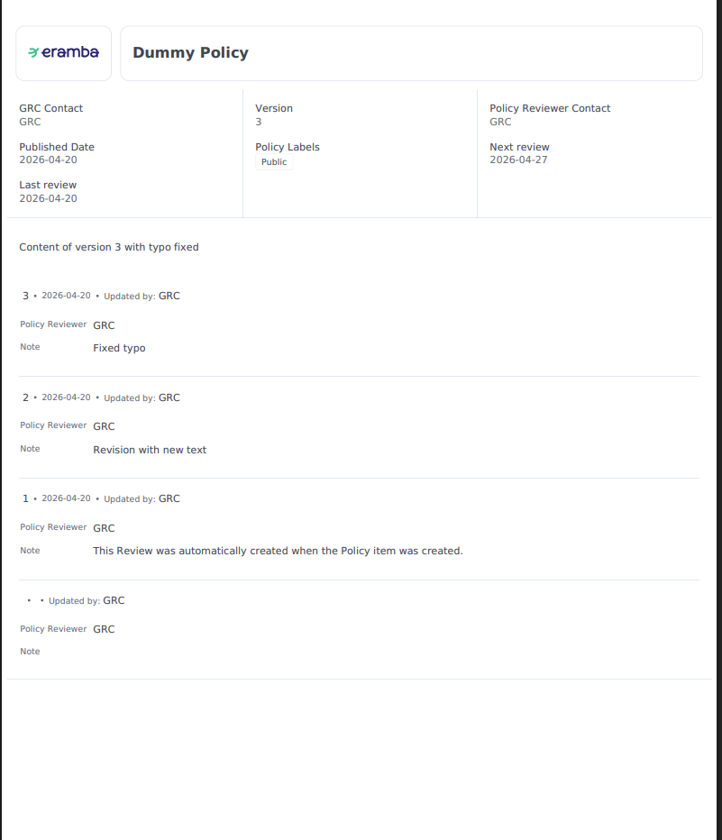 All fields are present: Version, Policy Reviewer Contact, Updated by, and Update Notes.