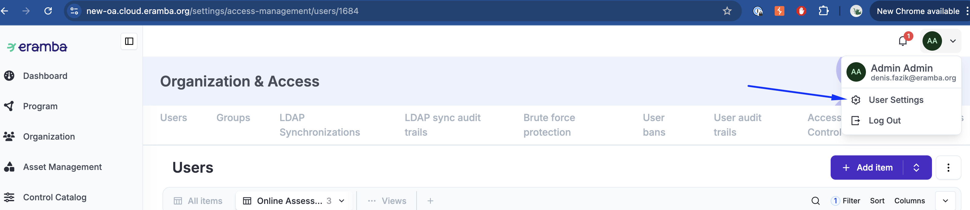 - Go to the user management (if ACLs allowed)