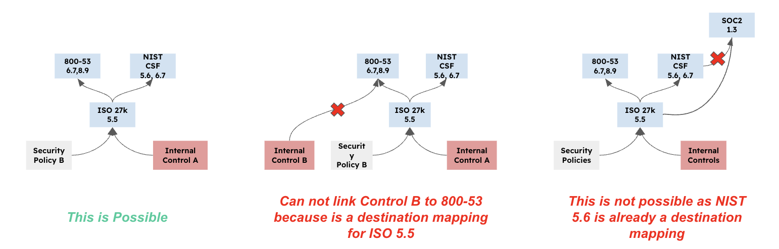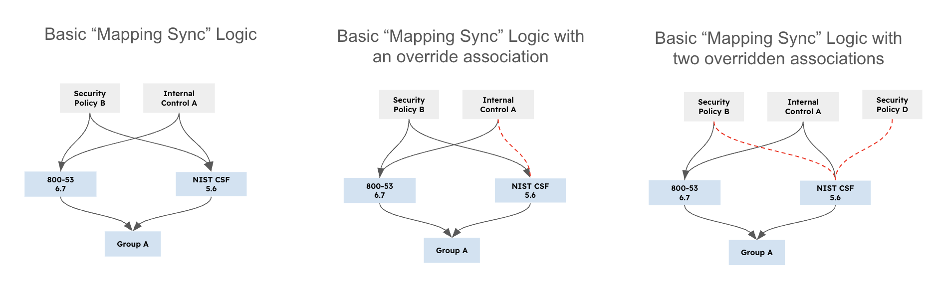 The normal “Mapping Sync” would keep something as shown on the left diagram. We need to give users the chance of editing, for example, “Compliance Package Item” by the name “NIST CSF 5.6” and remove, only for this item, the association with “Internal Control A” WITHOUT affecting “800-53 6.7”. This will be called an “Override Addition” or “Override Deletion” (or something like that). This is represented on the diagram in the middle and on the right.