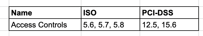 The rows of the index show the name and a list of mapped items for each compliance package (if nothing on a package is included, we leave the cell empty).
