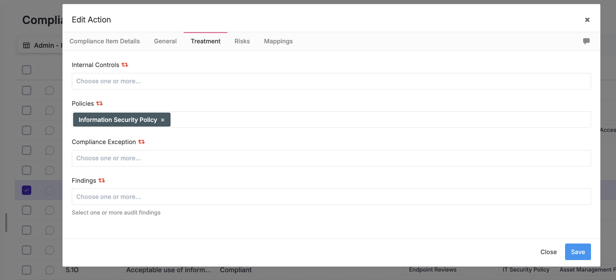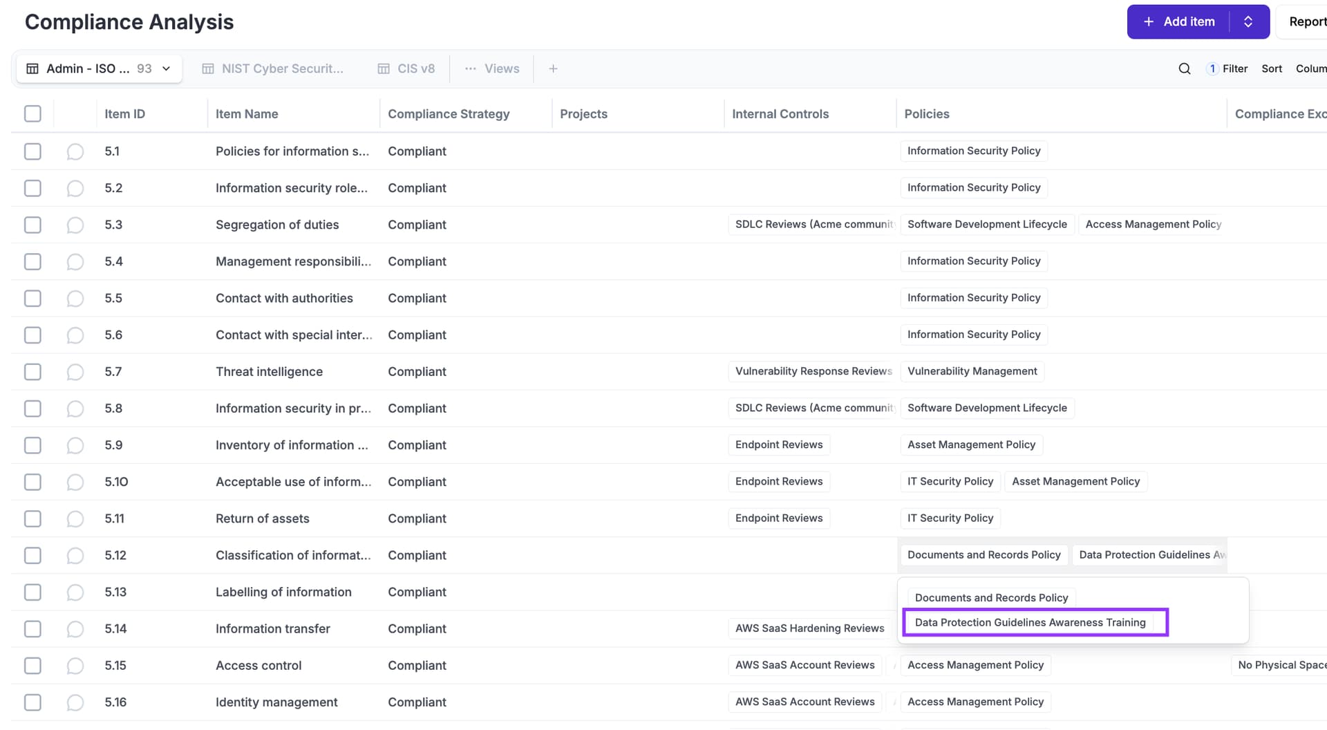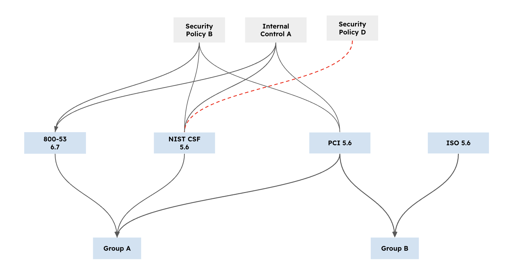 - You will associate “Control A” and “Policy B” to the item “NIST CSF 5.6”