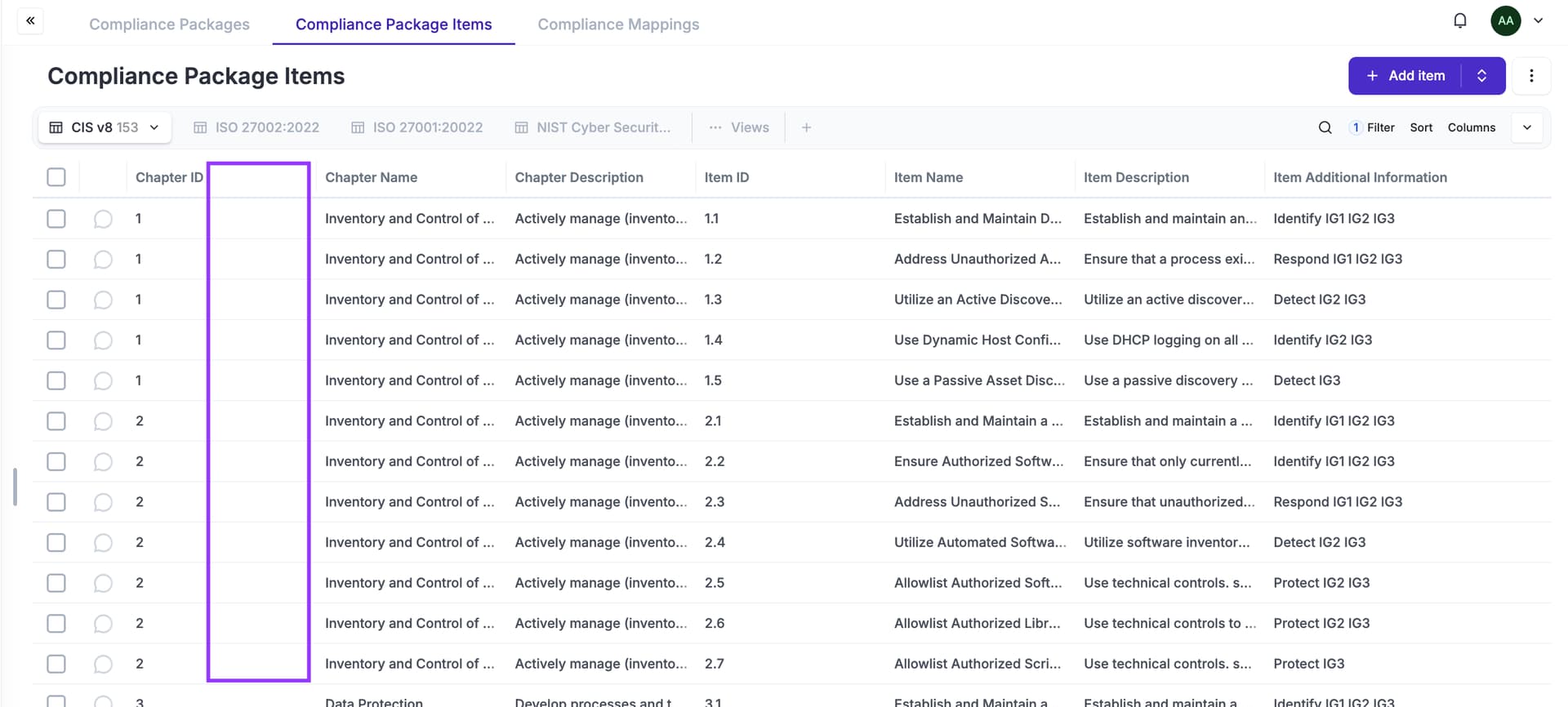 The tab “Compliance Package Items” will now have an additional column called “Mapping Groups” with these new fields if applicable.