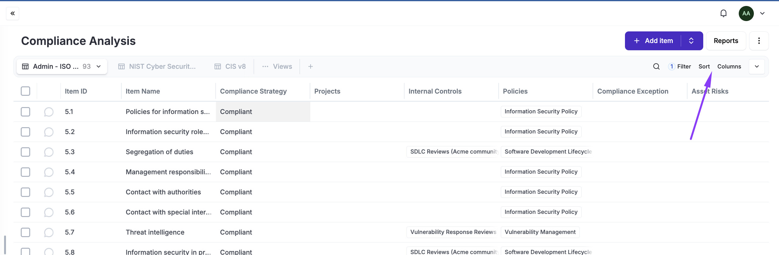 Since we now manage a concept of “Groups” it will be useful to display items on modules with an optional “Group By” setting. This setting will be defined per module per field, by default we will just test it on the “Compliance Analysis” module.