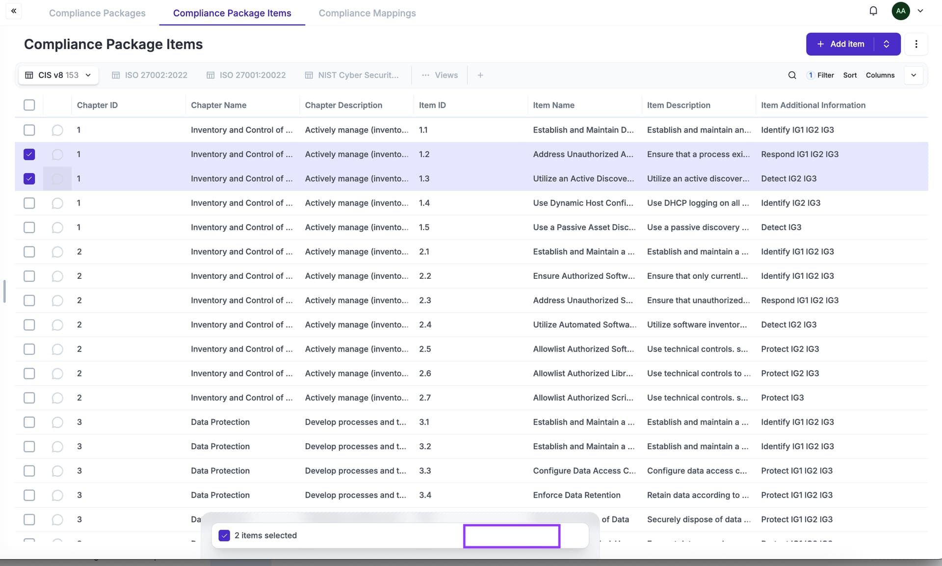 - Update compliance package items using bulk edits so they can be associated with those Mapping Groups