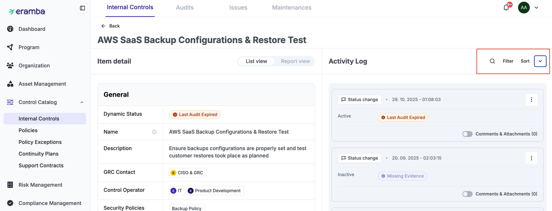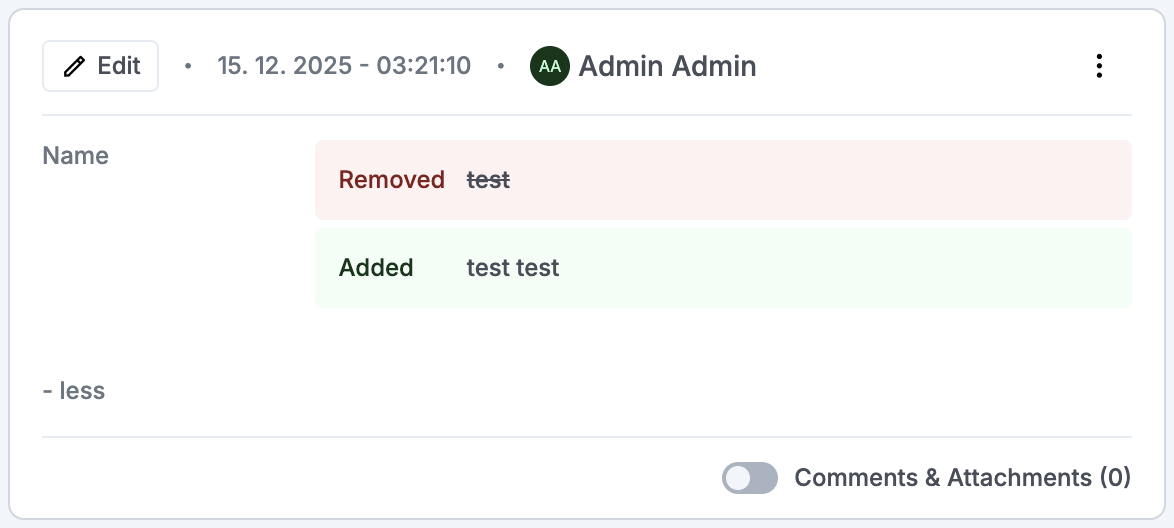 The activity log supports searching, sorting, and filtering, in the same way you are already used to from index views. This allows you to quickly locate specific changes or events, even for items with a long history.