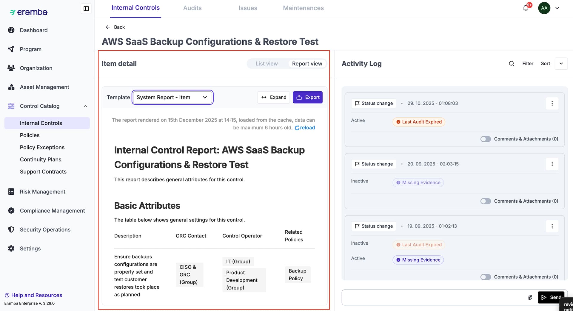 On the left side, you can see all the fields of the item. This view is similar to the form used when creating or editing an item, but it is optimized for reviewing existing data. From here, you can also switch to the report view and run item-specific reports directly, without leaving the page.