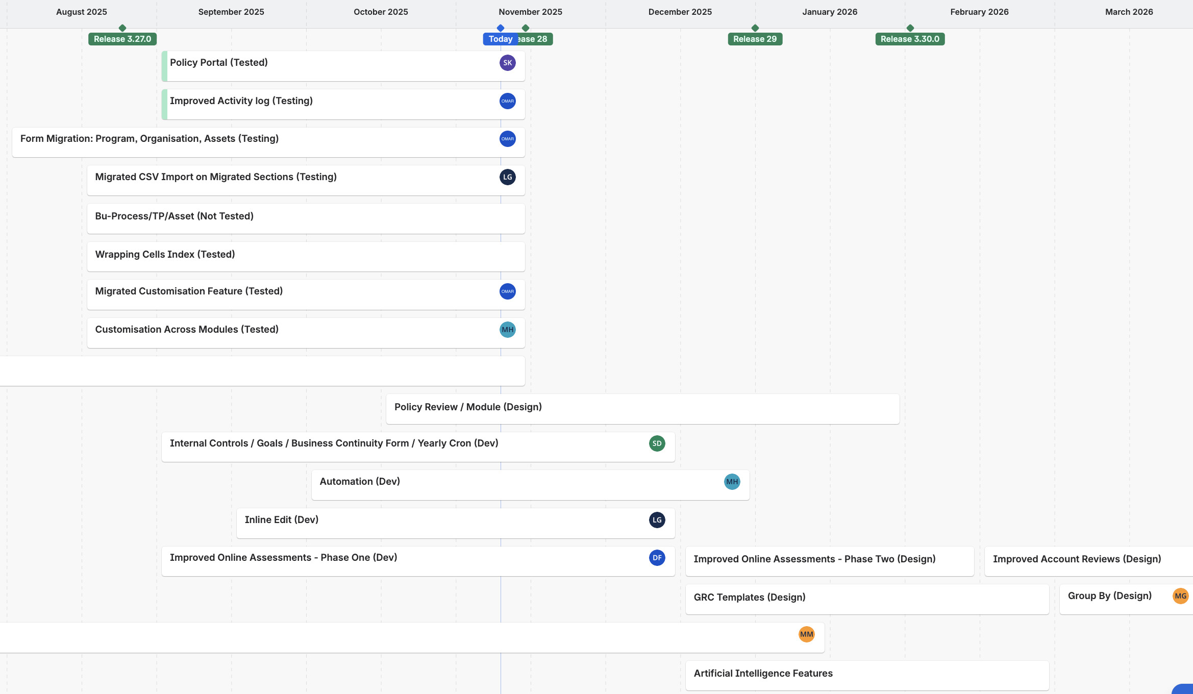 - The horizontal bars itemize key features we are working, their name, their status (design, ux, dev, test) and in which release they should be released.