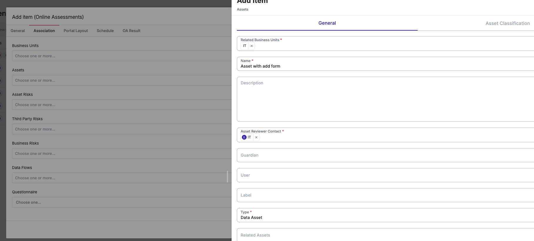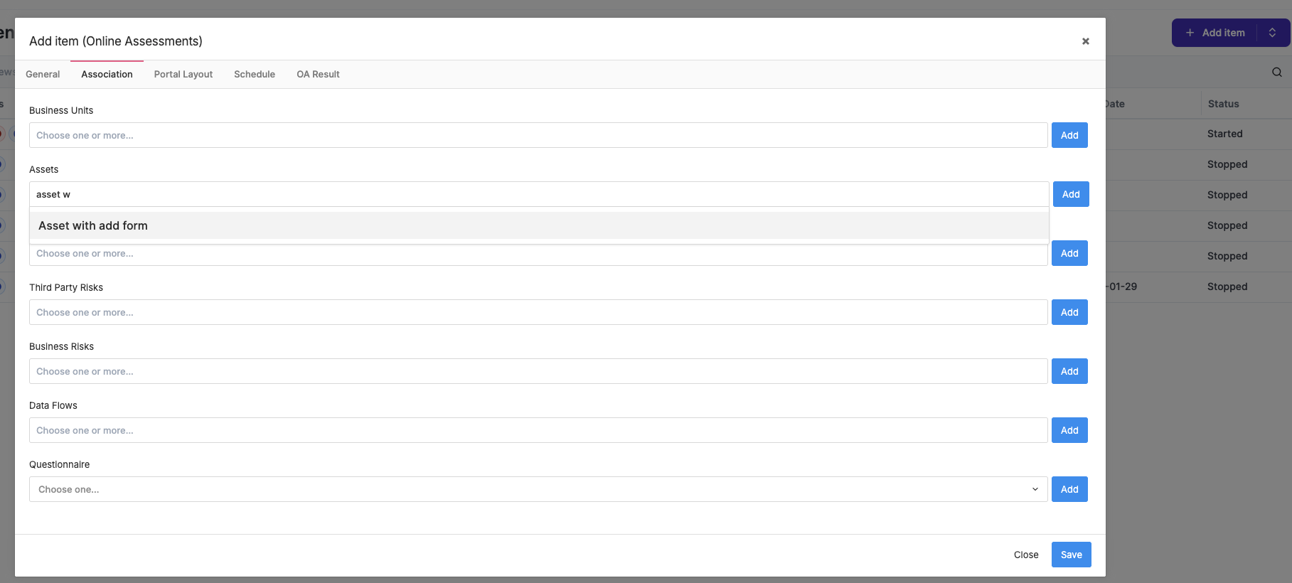 This is at the “association” section of the “add item” step of creating a new assessment where you can associate assets or business units, etc. with an assessment prior to creation.