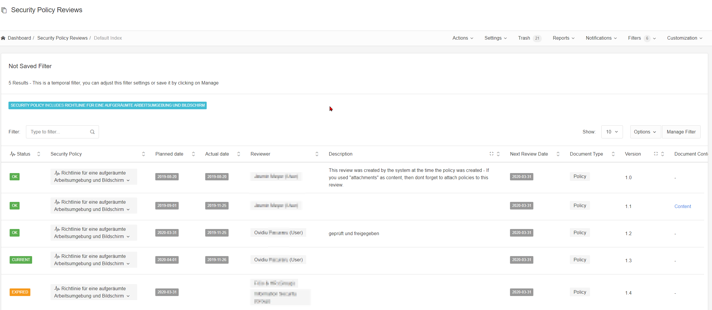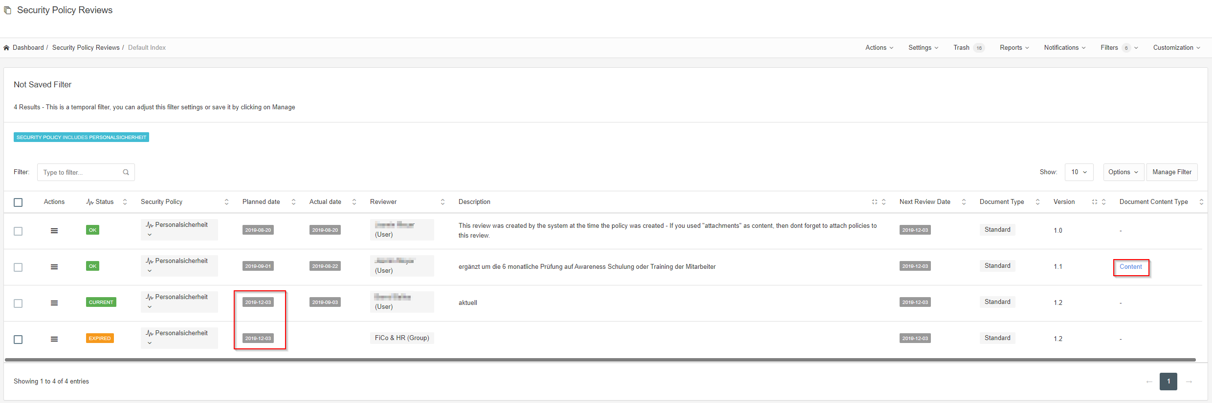 Now here it gets confusing. I have 2 planned reviews with the same date, one current, one expired. Also only 1 review shows “Document content type” as “content”