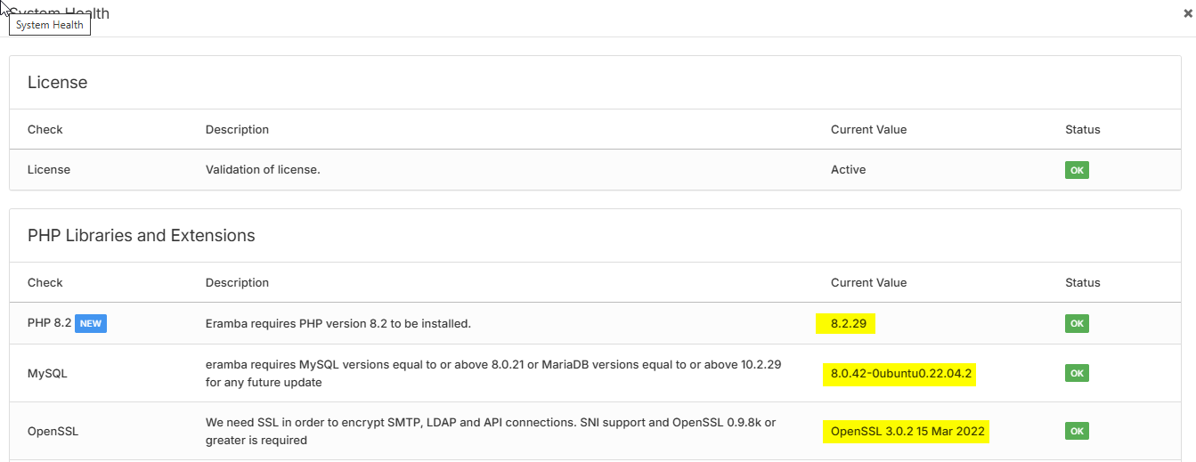 My system health page from my Eramba dashboard shows these versions. Do I need to manually upgrade anything? Why don’t you just publish the new requirements if any, instead of linking to a 2-year-old post.